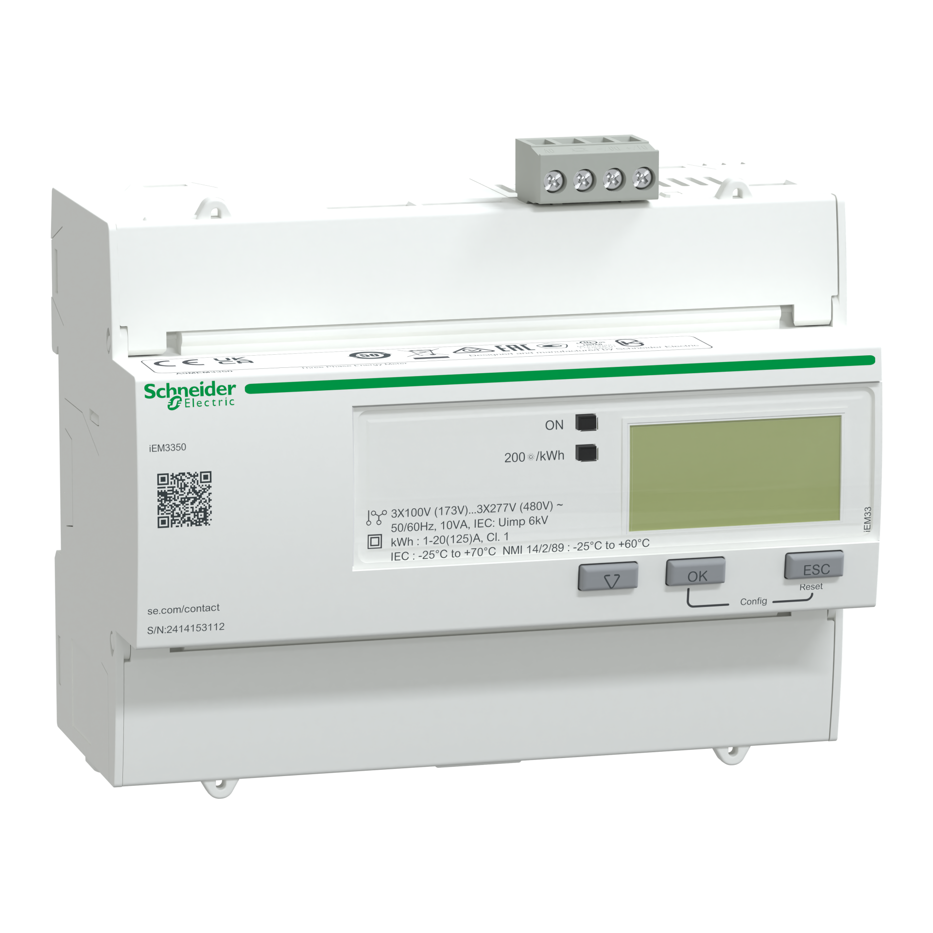 The Acti9 iEM3000 series energy meters offer an attractive range of three-phase DIN rail-mounted energy meters with an LCD display. Additional local signaling includes green LED power-on indicator, flashing yellow LED for accuracy checking and communication indicators. This meter can be used in sub-billing and partial metering applications. The meter provides the following accuracy classes: Active Energy: class 1 per IEC 62053-21, and per IEC 61557-12. The meter will measure Active and Reactive Power, Active and Reactive Energy, Voltage and Current. Designed for 50Hz or 60Hz networks, supply voltage can range from 100 to 277VAC or 173 to 480VAC. Line rated current for this meter is up to 125A via direct connect and will support Single Phase and Neutral, Three Phase and Three Phase and Neutral configurations. Communication protocol is Modbus with screw terminal support. No secondary communication ports. Certifications include EAC, CE and UL. Product dimensions are as follows: width 4.96 in (126 mm), depth 2.72in (69 mm), height 4.1 in (103 mm) and product weight 9.17 oz (260 g). Compatible with power management software to take advantage of the IoT digital power installation.