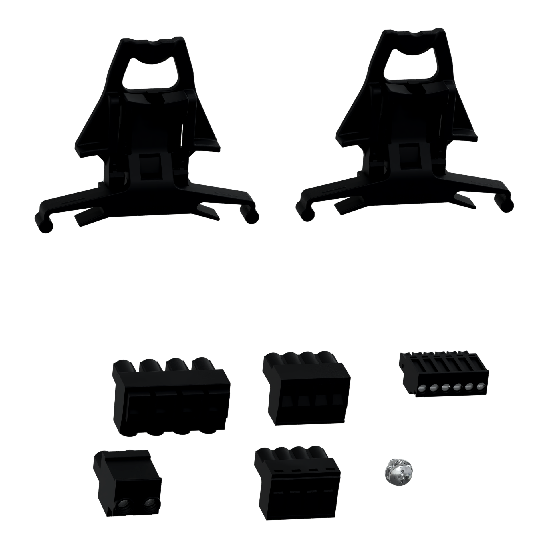 Hardware kit for PowerLogic PM53xx Series meter. Kit includes a quantity of 4 input terminal connectors (communication, power supply, and CT screws) and panel mounting hardware.